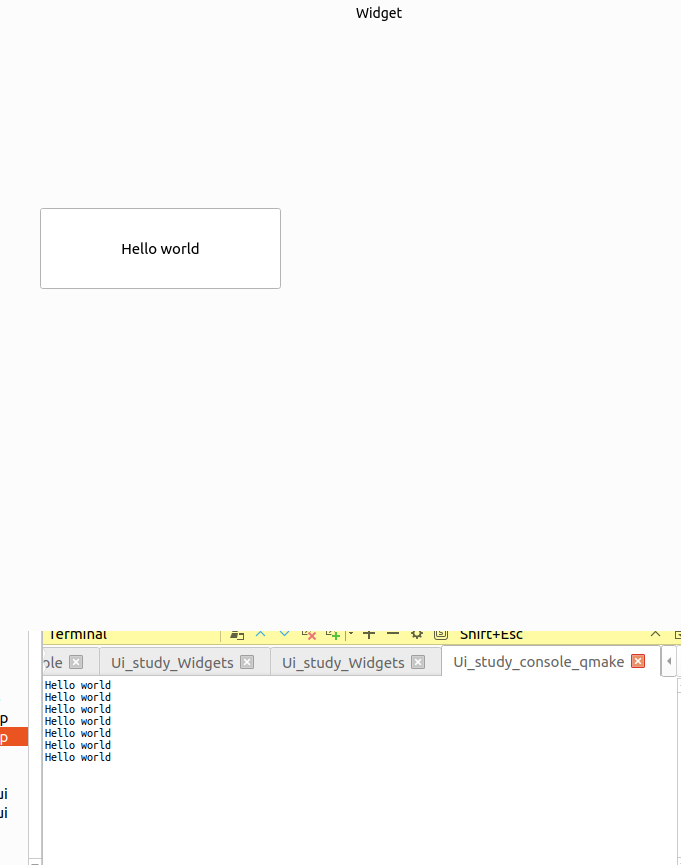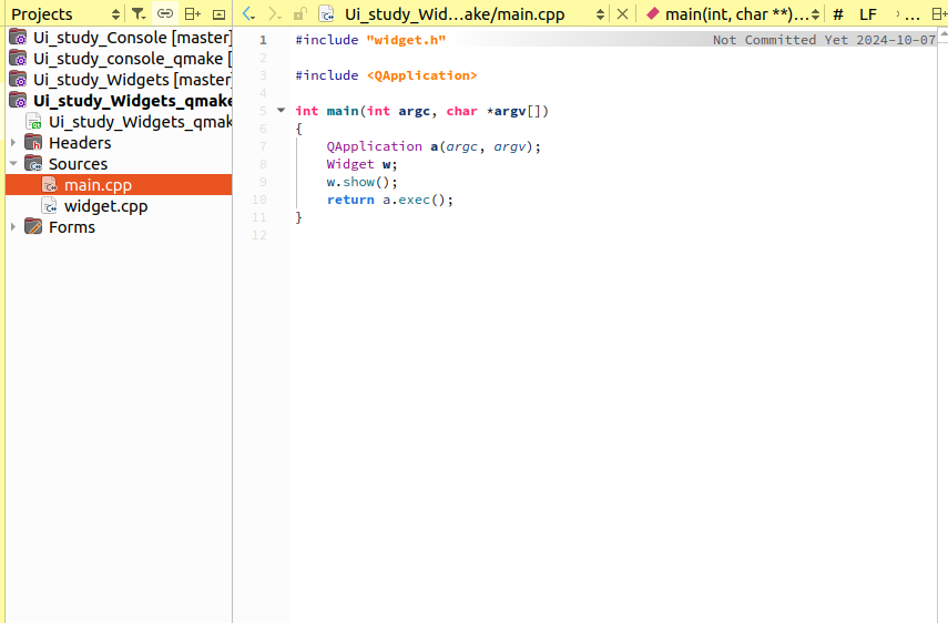 이 파일은 나중에 컴파일 시, Qt가 자동으로 C++ 소스코드로 변환해 준다. widget.ui 는 Widget 클래스와 매핑 되어 있으며 여기서는 클래스 이름과 ui 파일의 이름은 동일하게 저장되어 있지만, 동일하지 않아도 된다. - 또한 여기서는 1개의 ui 파일만 존재하지만 2개 이상의 GUI를 가질 수 도 있다. 예를들어 한 개의 클래스는 여러 개의 ui 파일과 매핑 할 수 있다.