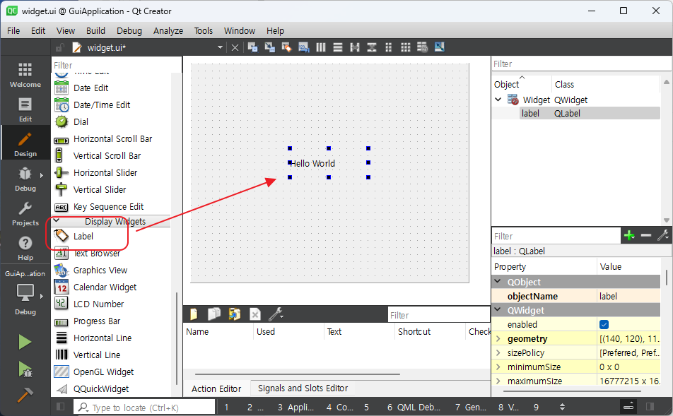 widget.ui 파일을 더블 클릭하면 아래 그림에서 보는 것과 같은 화면을 볼 수 있다. 아래 화면에서 QLabel 을 배치하고 그 위젯에 내용을 Hello World 로 바꾼 후 실행해 보도록 하자.