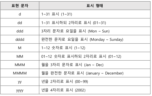 QDate 클래스는 원하는 포맷으로 날짜를 표시하기 위한 방법으로 QString 데이터 타입을 리턴 하는 멤버 함수를 이용하면 날짜를 다양하게 표현할 수 있다.