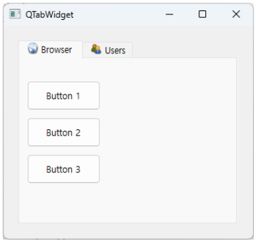 - 이 위젯은 QTabWidget 과 비슷한 기능을제공한다. 탭에 아이콘을 사용 하기 위해서 setTabIcon( ) 함수를 사용하면 된다.