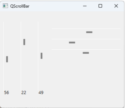 - QScrollBar 위젯 클래스는 슬라이더 위젯의 모양과 비슷하다.