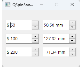 QSpinBox와 QDoubleSpinBox 위젯 클래스는 사용자가 변경할 수 있는 값의 범위를 제한할 수 있으며 숫자가 표시되는 Prefix와 Suffix 부분에 특정 문자 혹은 단위를 가리키는 문자를 사용할 수 있다. - 예를 들어 화폐 기호를 위젯 안에 사용할 수 있다.