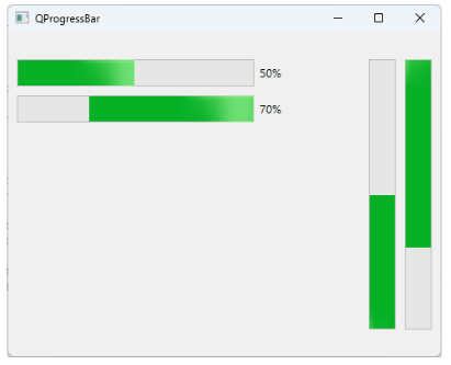 - 진행사항을 표시하기 위한 위젯으로 QProgressBar 위젯을 사용할 수 있으며 위젯의 배치 방향을 가로 또는 세로로 표시할 수 있다. QProgressBar 위젯은 가로 방향으로 배치할 경우 왼쪽에서 오른쪽으로, 오른쪽에서 왼쪽으로 진행방향을 변경할 수 있다.