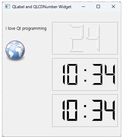 QLCDNumber 위젯은 숫자만 표시할 수 있으며 디지털 시계와 같은 형태로 숫자를 표시할 수 있다. - QLCDNumber 위젯은 시간을 표시할 때 사용하는 “ : ” 문자를 함께 사용할 수 있다.