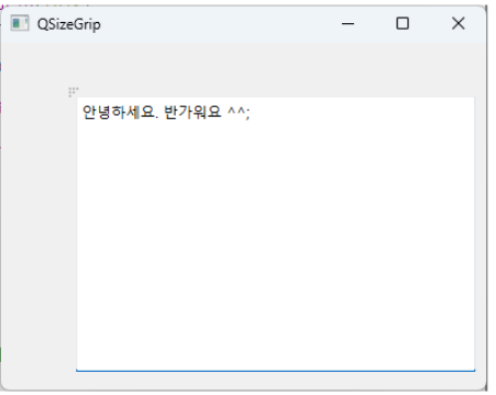 - QSizeGrip 클래스 위젯은 한정된 크기의 윈도우 영역 안에 위젯의 크기를 조절할 수있다.
