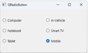 - QRadioButton 위젯은 사용자에게 여러 항목 중 하나를 선택할 수 있는 GUI를 제공한다.