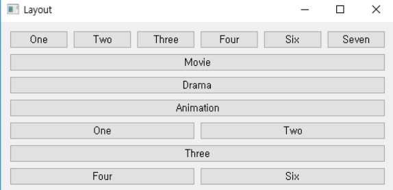 | QGridBocLayout | 위젯을 그리드(Grid) 또는 바둑판 스타일로 배치 |