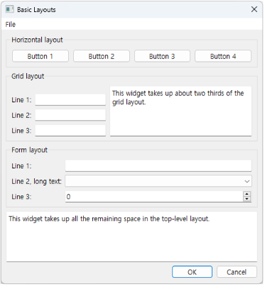 - QGridLayout은 특정 행을 하나의 위젯만 배치할 수 있도록 병합 하거나 여러 개의 셀로 나눌 수 있다.
