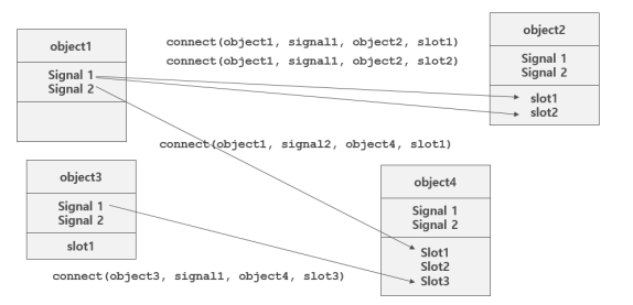 Qt는 이벤트를 처리하기 위한 메커니즘으로 시그널(Signal)과 슬롯(Slot)을 사용한다.