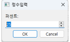 int i = QInputDialog::getInt(this, "정수입력", "퍼센트:",