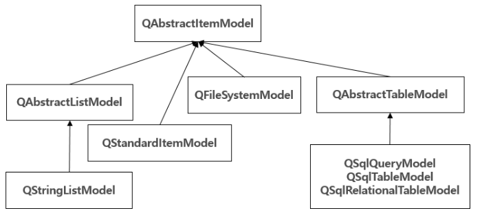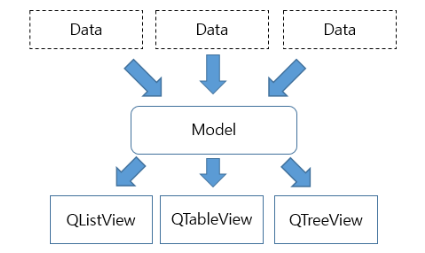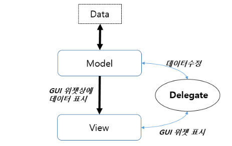 ListView, QTableView, QTreeView 클래스 들은 위젯에 데이터를 삽입/수정/삭제 하기 위해 각 클래스에서 제공하는 멤버 함수를 사용하지 않고 Model 클래스를 사용한다.