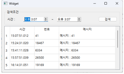 - createUserInterface( ) 함수에서는 GUI 상에 배치한 QTableView 위젯을 설정한다. 그리고 GUI상에서 보는 것과 같이 시간을 검색하기 위해 QTimeEdit의 시간을 현재 시간으로 설정한다.