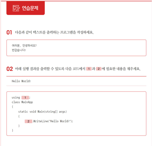 - 만약 우리가 이 문장을 생략했다면 예제 코드 13행의 Console.WriteLine (… ) ; 코드는 System.Console.WriteLine (); 으로 글자 수가 늘어났을 것 입니다.