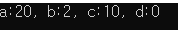 Console.WriteLine($"a:{a}, b:{b}, c:{c}, d:{d}");