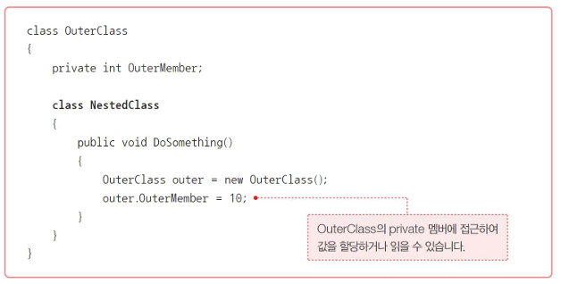 위의 예제와 같이 중첩 클래스는 다른 클래스의 private에 자유롭게 접근이 가능하다는 점에서 은닉성을 무너뜨리는 단점이 있지만, 더 유연한 표현력을 선사 할수 있는 장점이 있다고 합니다만, 이걸 어떻게 써야할지는 아직 모르겠네요.